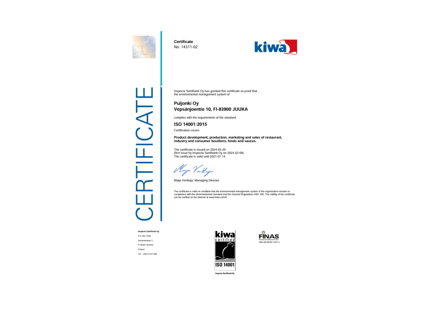 Certifikat: ISO 14001 - OSCAR A/S / Puljonki Oy - Fabrikken i Juuka, Finland