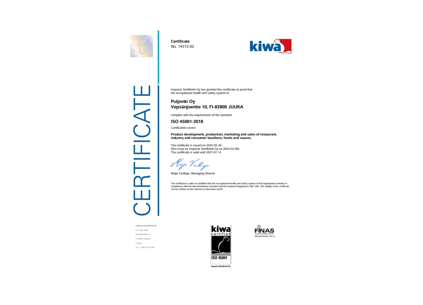 Certifikat: FSSC 22000 - OSCAR A/S / Puljonki Oy - Fabrikken i Juuka, Finland