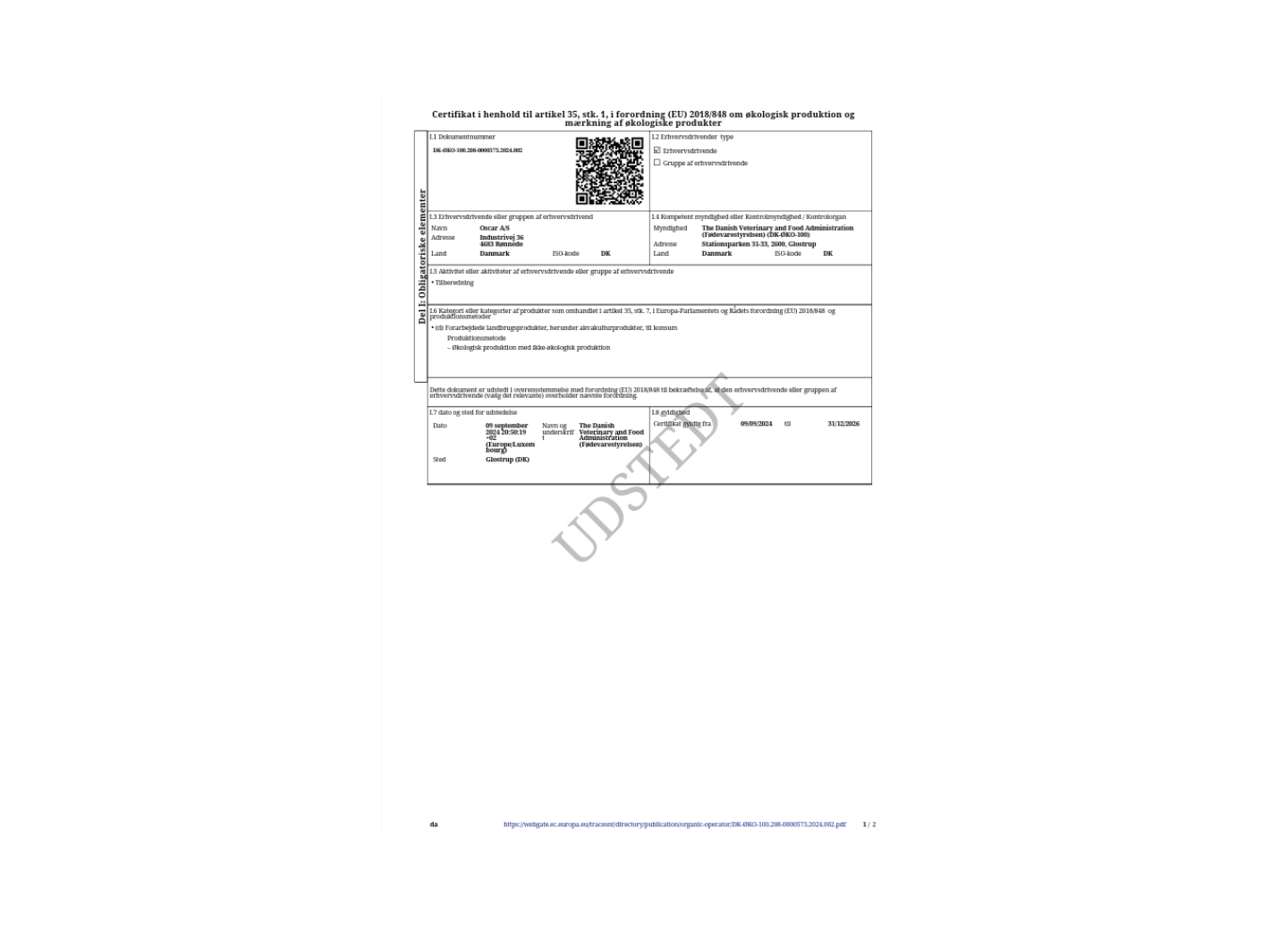 Certifikat: Økologi - OSCAR A/S - Fabrikken i Rønnede, Danmark